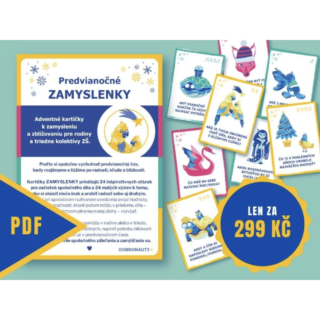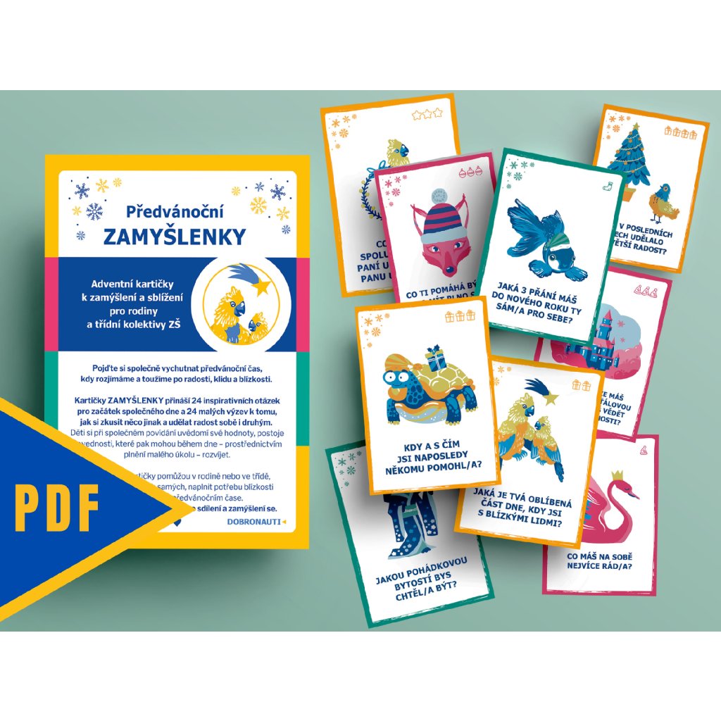 - PDF kartičky Předvánoční ZAMYŠLENKY – sada inspirativních karet (připraveno pro oboustranný tisk na A4, celkem 56 stran)