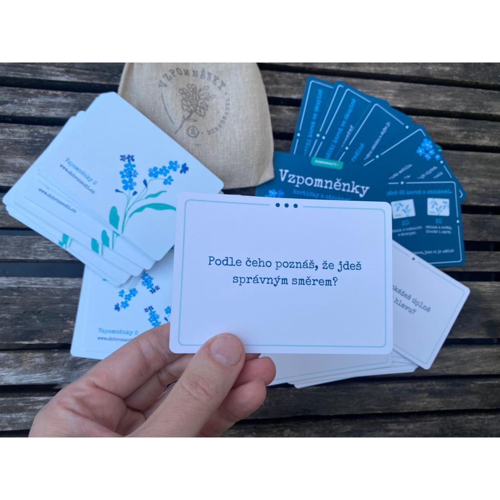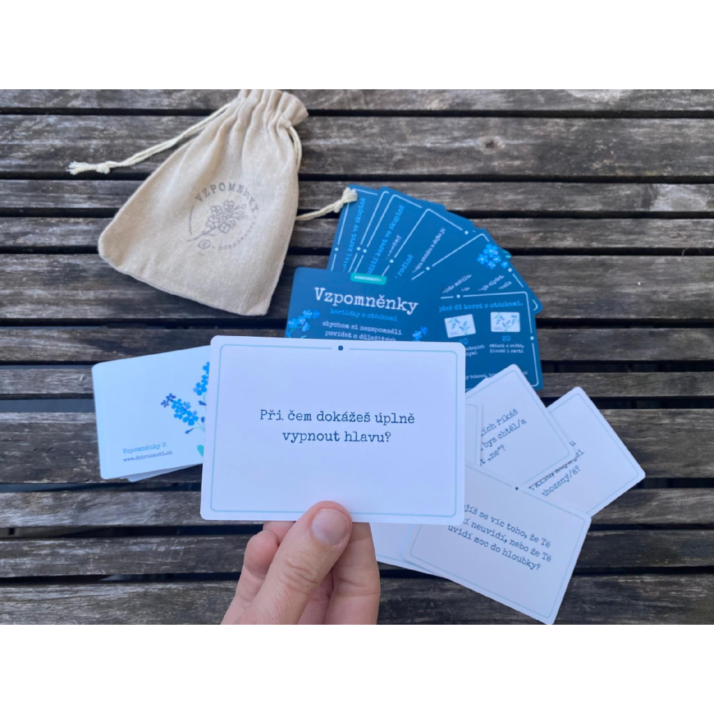🌿 VZPOMNĚNKY (60 karet) Originální edice, se kterou to všechno začalo. Otázky pro mezigenerační sdílení, rodinné večeře a třídnické hodiny. Pomůžou vytvořit bezpečný prostor pro vzájemné poznávání a sdílení příběhů.